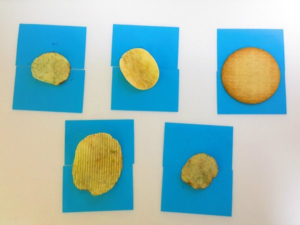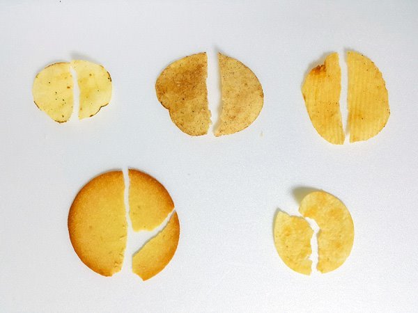 바삭함을 알아보기 위해 눈썹미용가위로 ‘감자Chip’을 동그랗게 잘라보고, 일직선으로 잘라봤다. 동그랗게 잘랐을 때 ‘생생칩 콘포타쥬’, ‘포테토칩 짜왕맛’은 부서지는 것 없이 비교적 부드럽게 잘라졌다. ‘스윙칩 간장치킨맛’은 잘 잘라지는 만큼 와그작와그작 잘 부서졌으며, 굴곡진 표면 때문에 동그란 모습은 실패했다. ‘맥스 포테이토 크리스프’와 ‘프링글스 스윗마요치즈’는 가위를 대면 부서졌지만 동그란 형태는 갖출 수 있었다.