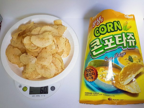 실제로 잰 ‘생생칩 콘포타쥬’의 1개 중량은 2g, 전체 중량은 60g으로 기재된 중량과 차이가 없었다. ‘콘칩’과자를 먹는 것 같았고, 짠 맛보다 단 맛이 더 강했다. 씹는 느낌은 바삭 하진 않았지만 중독 과자라고 칭해진 이유를 알 것 같았다. 과자의 포장지색을 보면 맛에 대한 느낌을 어림짐작할 수 있는데 노란 병아리의 화사한 느낌의 맛이 이런 것이라는 걸 먹어보면 알 것이다.