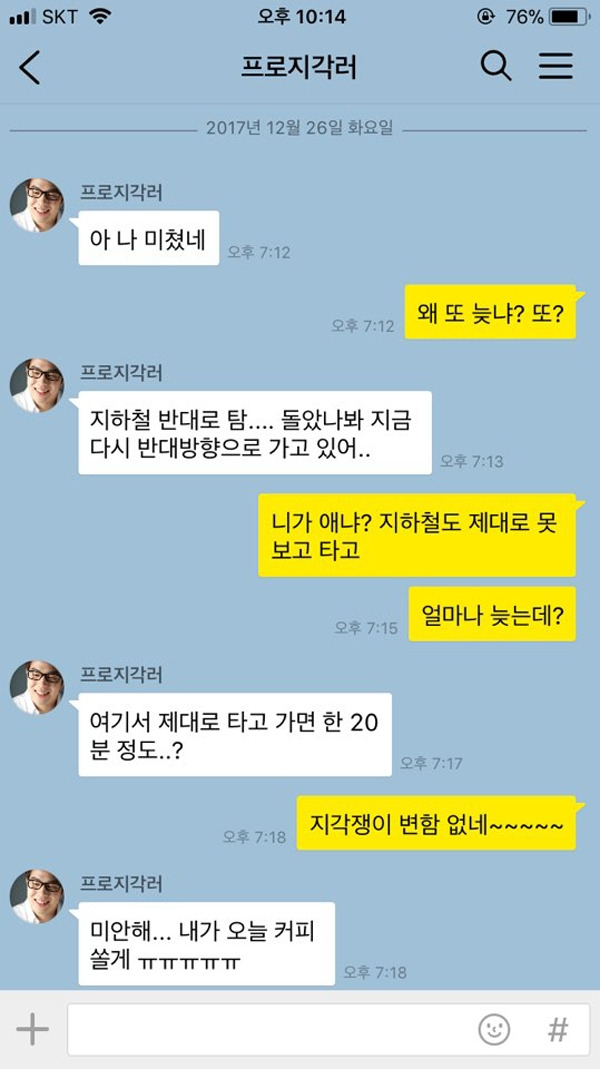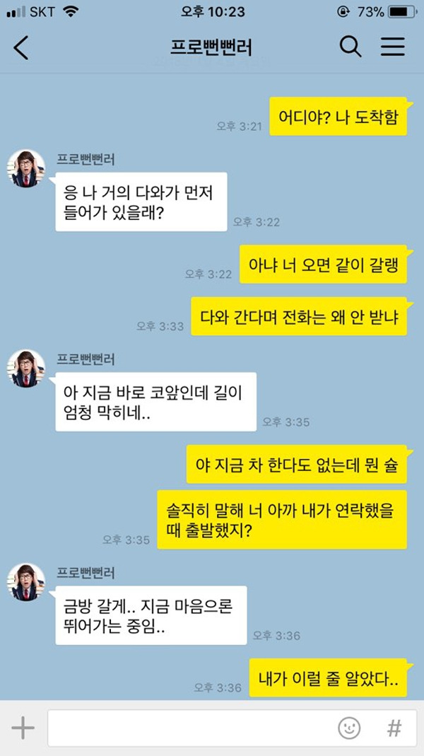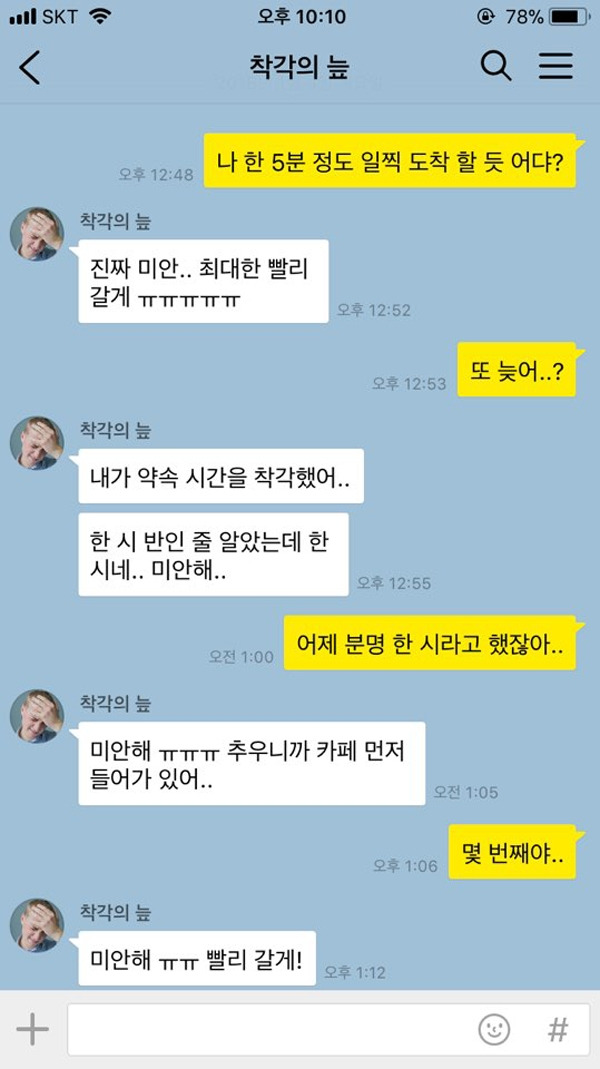 착각할 게 따로 있지 약속 시간을 착각하십니까! 물론 일이 바쁘다 보면 가끔씩 헷갈릴 수는 있다. 그러나 혹시라도 시간을 잘못 알까 싶어 시시때때로 약속 시간을 알려준 경우라면 이야기는 달라진다. 약속 시간을 이야기했을 때 힘차게 대답하던 때의 친구는 어디로 간 걸까? 짧게는 30분부터 길게는 한 시간을 넘기기까지! 친구의 사소한 실수 덕분에 소중한 내 시간들이 날아가 버리고 만다.