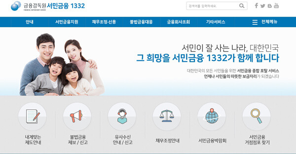 서민금융1332( http://www.fss.or.kr/s1332 )는 서민맞춤대출 안내, 불법사금융 대응요령, 개인신용정보 무료체험, 제도권 금융회사 조회, 소득수준·신용등급에 맞는 지원제도 안내 등 종합적인 정보를 제공하는 사이트이다. 이곳에선 무료신용조회를 통해 신용등급을 확인한 후 각 서민금융기관에 신청하거나 다양한 서민들을 위한 대출제도를 검색해 볼 수 있고, 제도권으로 금융회사 조회·등록대부업체 조회·대출모집인 조회를 통해 거래 상대방을 확인가능하고 불법사금융 피해사례를 통해 대응요령을 습득할 수 있다.
