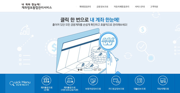 휴면계좌에 국한하지 않고 사용 중인 계좌를 포함한 모든 은행 계좌를 조회하고 싶을 경우에는 계좌통합관리서비스( www.accountinfo.or.kr )에 접속하면 된다. 금융결제원에서 관련 시스템을 구축 및 운영하고 있는 이 사이트에선 본인의 은행 및 서민금융기관의 계좌를 한 눈에 조회하고 1년 이상 거래가 없는 소액 비활동성 계좌를 잔고이전·해지할 수 있다.