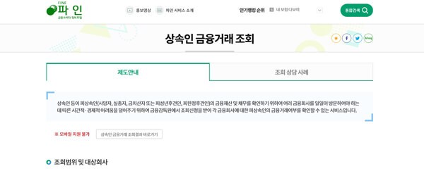 상속인금융거래조회서비스를 통해서는 피상속인(사망자)의 자산을 확인할 수 있는데, 이 역시 금융소비자 정보 포털사이트 파인( fine.fss.or.kr )의 서비스 메뉴에서 확인이 가능하다. 이 서비스는 상속인이 금융회사에 있는 피상속 명의의 모든 금융채권, 금융채무 등의 존재 유무 및 공공정보 등을 일관 조회할 수 있도록 해준다.