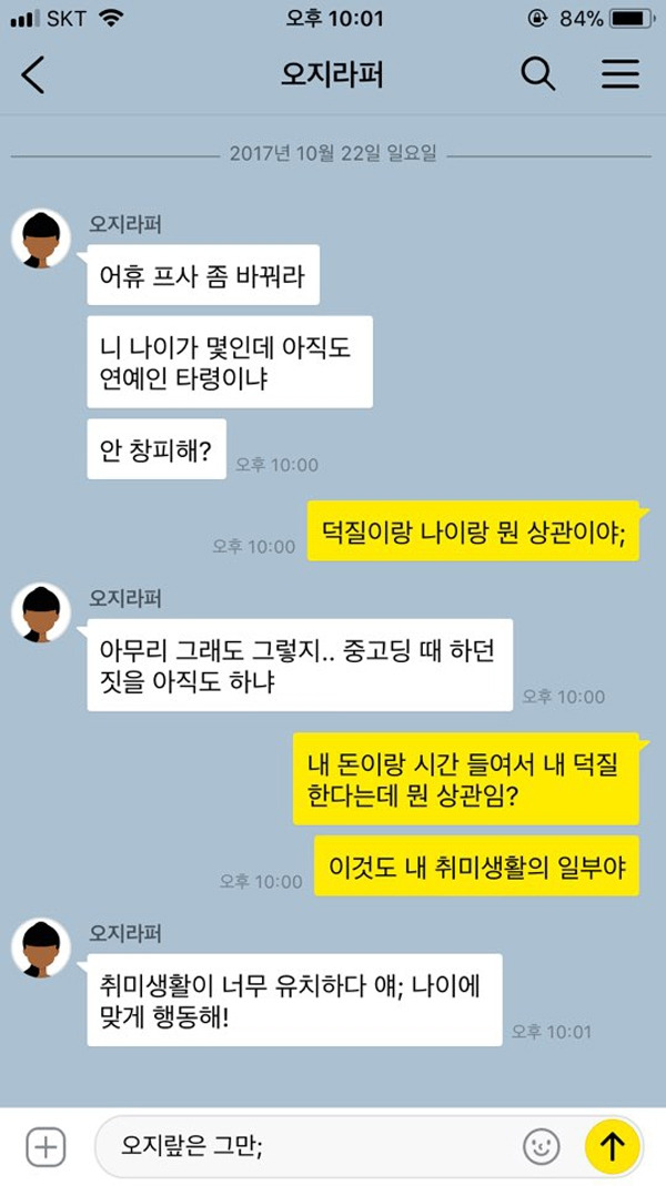 누군가를 좋아하는 것에 있어서 나이의 제한이 있나요? 청소년들을 겨냥해 만들어진 아이돌 그룹이 많은 편이지만, 그렇다고 20대 이상의 성인이 좋아하지 말라는 법은 존재하지 않는다. 60대 어르신이 트로트를 좋아하고, 50대 중년이 건담을 좋아하는 것과 같은 일종의 취향일 뿐. 이런 말을 하는 본인은 얼마나 나이에 맞게 어른스러운 취미를 즐기며 살아가고 있는지 되묻고 싶다.