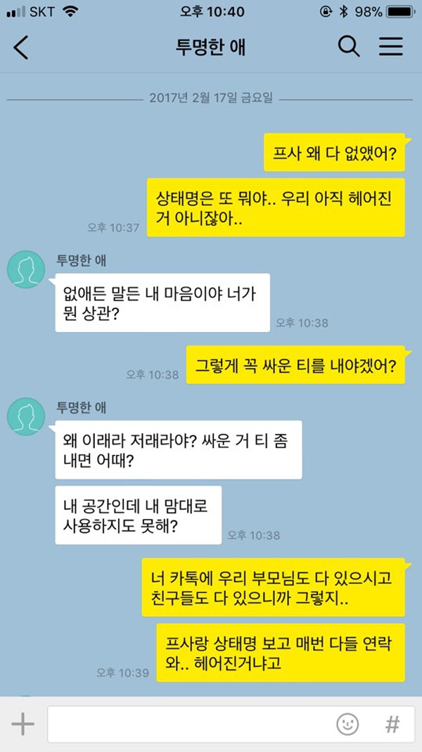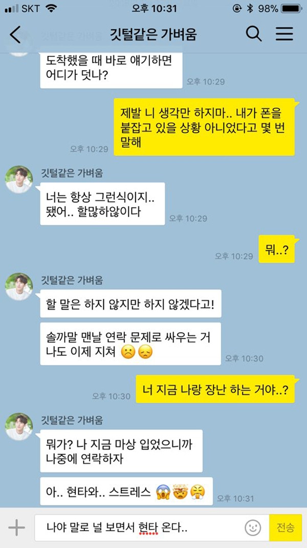 카톡의 가장 중요한 기능 중 하나인 ‘읽음 표시’. 유용한 기능이지만, 때론 싸움을 더 크게 번지게 하는 요인으로 작용하기도 한다. 잠시 핸드폰을 내려놓거나 다른 일에 신경을 쓰게 되면, 1이 사라지지 않아 상대방에게 집중하지 않는다는 느낌을 줄 수 있기 때문. 특히 연인끼리 다툴 때에는 예민한 상태이기 때문에 바로 바로 사라지지 않는 1은 섭섭함과 동시에 분노를 일으키게 만든다.