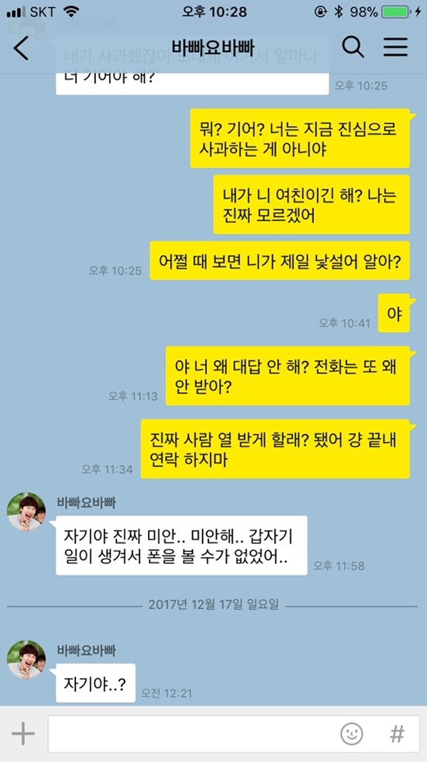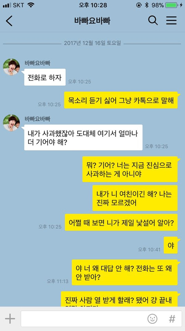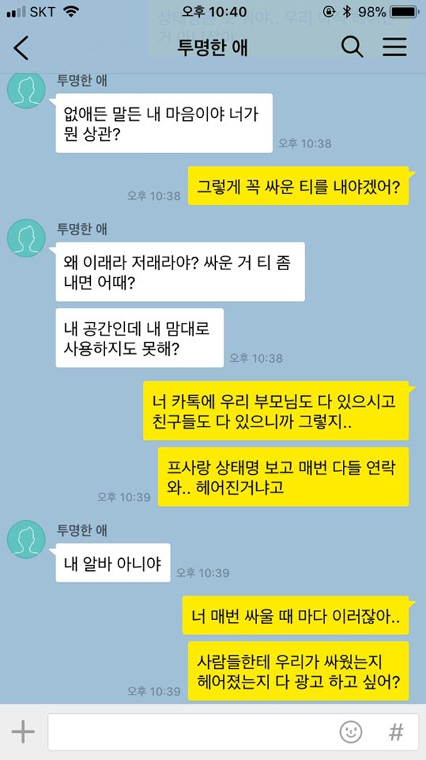 전화나 문자보다는 카톡을 사용해 연락하는 연인들이 많아짐에 따라, 카톡으로 다투게 되는 경우도 다수 생기게 되었다. 그러나 카톡으로 다툴 때에는 특히 더 주의를 기울여야 한다. 바로 바로 읽음 표시가 뜰 뿐만 아니라, 사진 및 동영상이 활용 가능하고, 프로필 사진, 탈퇴, 상태 메시지 등의 별도의 기능들이 많기 때문. 연인과 카톡으로 다툴 때 반드시 하지 말아야 할 행동들을 모아 보았다.