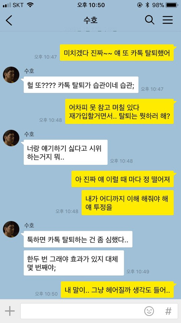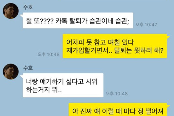 싸울 때 마다 걸핏하면 카톡 탈퇴를 하는 연인. 마치 “나 화났어”라고 시위하는 듯한 모습이 영 좋아 보이지는 않는다. 한두 번이야 그럴 수 있다 쳐도, 그 횟수가 잦아지게 되면 오히려 역효과를 불러일으키는 행동 중 하나. 만약 탈퇴해 연락을 할 수 없는 카톡 대신 전화나 문자로 연락을 취하지 않는다면, 화해할 생각이 없는 거냐며 더욱 더 화를 낼 것이 뻔하다.