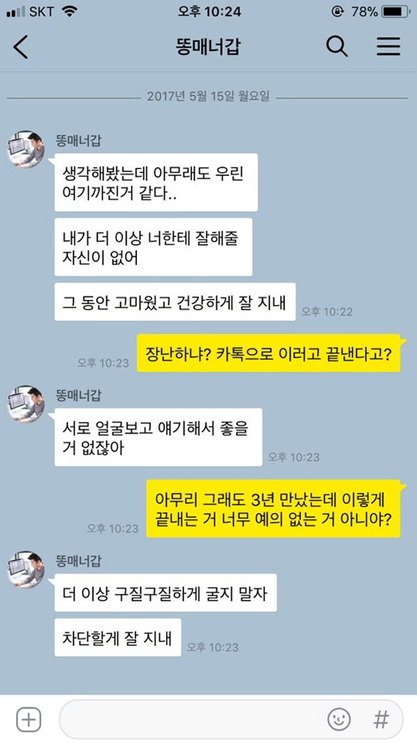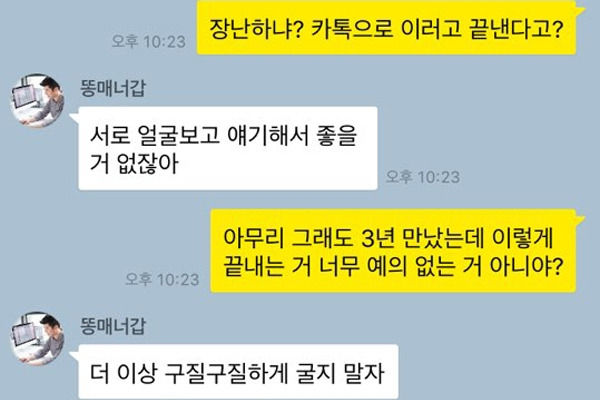 최악의 이별 1위, 카톡이별이다. 아무리 인터넷이 발달하고 온라인 메신저가 활발해진 세상이라고 할지라도 연인 사이에 이별을 카톡으로 전하는 건 대체 무슨 경우인가? 얼굴을 보면 안 되는 상황이라거나, 얼굴을 볼 가치조차 없는 상황을 제외하고선 정말 최악의 이별통보라고 할 수 있다. 연인 사이의 최소한의 예의도 없는, 그나마 남아있던 정 조차 말끔히 없애버리는 카톡 비매너 유형이다.