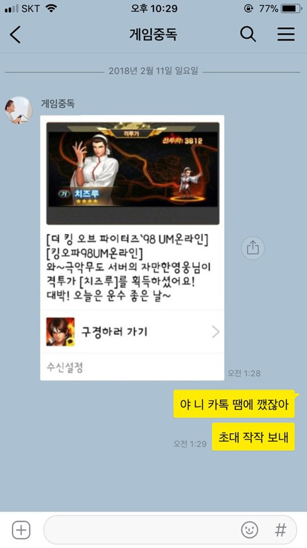 말도 많고 탈도 많았던 게임 초대 메시지이다. 친하지 않는 사이에 보내는 게임 초대 메시지도 문제지만, 시간대를 막론하고 보내는 것 역시 제대로 된 카톡 비매너 중 하나이다. 겨우겨우 잠들었을 때 울리는 카톡! 소리. 혹시나 급한 일일까 싶어 일어나 확인했을 때 게임 초대 메시지를 봤을 때의 기분이란 말로 다 할 수 없다. 게임 초대 메시지를 보내는 거야 어쩔 수 없다 치자. 상대를 봐가면서, 시간대를 봐가면서 보내는 것이 최소한의 예의라는 점 잊지 말자.