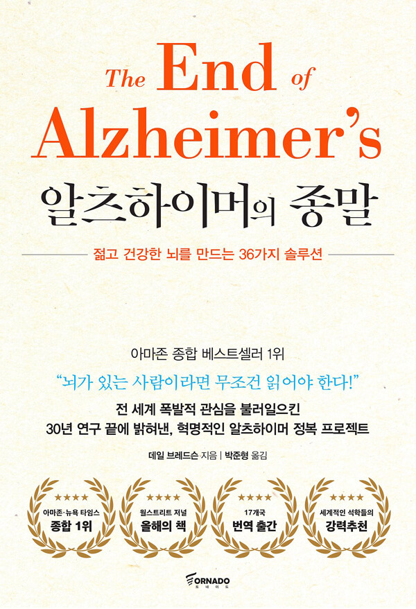 이에 데일 브레드슨 박사는 알츠하이머에 관한 많은 과학적 연구를 바탕으로 알츠하이머의 원인 인자와 생활 속에서 알츠하이머를 유발하는 요소에 대해 독자들이 쉽게 이해하고 생활 속에서 실현할 수 있도록 <알츠하이머의 종말>을 펴냈다. 그는 알츠하이머 발생에 영향을 미치는 생활 방식, 생활 습관을 개선하기 위한 개개인 맞춤형 치료 프로그램인 리코드를 만들어 이 책에서 자세하게 소개하고 있다. 물론 알츠하이머를 깨끗이 치료할 수 있다, 아니다를 판단하기는 이르지만 데일 브레드슨 박사의 리코드 프로그램이 알츠하이머를 유발하는 다양한 인자들을 예방하는 데 도움이 된다는 것은 자명한 사실이다.