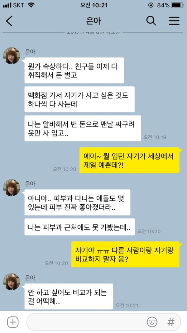 여자친구 입에서 다른 여자 이야기가 나올 때마다 이상하게 긴장이 된다. 특히 그 대상과의 비교가 시작되면 더욱더 이러지도 저러지도 못하는 상황이 연출되기 마련. 어떠한 대답을 하더라도 여자친구의 마음을 달래기 쉽지 않을 걸 알기에 조심스러워질 수밖에 없다. 그 어떤 다정하고 달콤한 말도 여자친구의 속상함을 해소해주기에는 어려운 듯해 머릿속이 복잡해진다.