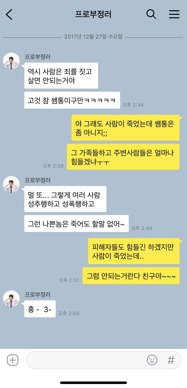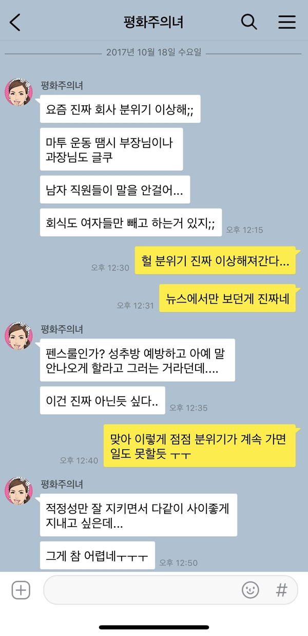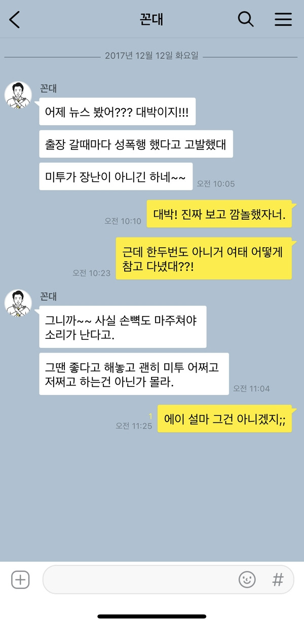곪고 곪아 터져버렸던 미투 운동. 폐쇄적인 체제에 있던 한 여성이 용기와 소신을 갖고 성추행 관련 고발을 하면서 사회적으로 미투 운동은 번져 나가기 시작했다. 우리나라 직장 문화에 암세포처럼 퍼져 있던 성추행과 성폭행 관련 문제들이 수면으로 드러나기 시작했고 그 결과는 사회적 파장을 불러일으켜왔다. 많은 여성들이 용기를 내어 고발을 했지만 이를 부정적으로 바라보는 시선들도 꽤나 많았다. 그들은 어떤 심리로 그런 말을 하게 됐을까? 카톡 대화로 부정적 시선을 가진 사람들의 심리를 파악해보자.