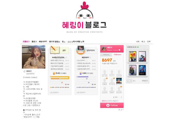 ‘다른 사람도 도우면서 그것을 계기로 자신도 성장할 수 있다’는 모토로 PPT 템플릿 나눔 프로젝트를 실행하고 있는 친절한 혜강씨의 블로그도 인기가 많다. 다양한 테마를 가진 템플릿과 PPT에 유용하게 쓰이는 아이콘, 그림도 제공하고 있어 쉽게 나만의 PPT를 디자인할 수 있다. 만약 스스로 만드는 게 익숙하지 않다면 유튜브에서 혜강씨의 PPT 튜토리얼 검색해보자. PPT 강좌로 매우 유명한 혜강씨인 만큼 내용이 매우 체계적이고 쉬운 구성으로 손쉽게 따라 할 수 있다.