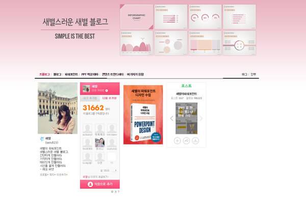 포토샵 없이 인포그래픽, 보고서, 제안서, 나만의 템플릿을 만들 수 있는 파워포인트 디자인 관련 서적까지 출간한 PPT 분야의 유명한 에디터, 유새별님의 블로그에서는 주로 컬러별 테마의 PPT 템플릿을 확인할 수 있다. 알록달록 예쁜 컬러의 조합으로 만들어진 템플릿은 심플하지만 확실하면서도 직관적인 포인트 효과를 줄 수 있다. 특히 디자인 구성 중 그래프에 많은 부분이 할애되어 있다 보니 통계 그래프가 많이 사용되는 과제에 사용하면 유용할 듯하다. 블로그뿐만 아니라 네이버 포스트에서도 PPT 강좌를 함께 하고 있으니 참조하면 좋다.
