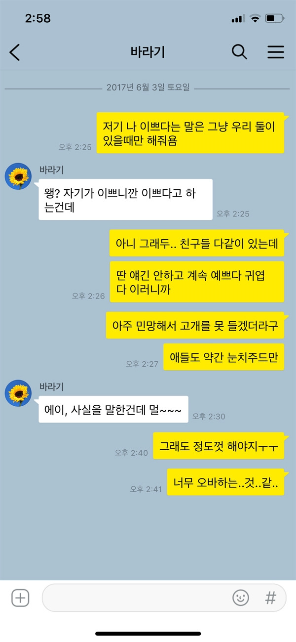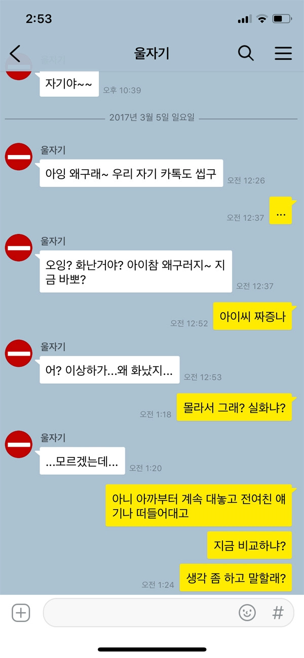연인과의 대화에서 전 이성친구에 대한 언급은 웬만해서는 하지 말아야 한다. 사실 그게 기본적인 예의이며 룰이다. 그럼에도 불구하고 반복적인 언급과 그로 인해 여자친구가 화가 났을 때 정말 도저히 모르겠다는 태도는 여자친구의 분노 게이지만 최대로 치닫게 할 뿐이다. 여자친구가 카톡을 읽씹하거나 ‘…’ 등의 ‘나 화났어’라는 태도를 보일 때에는 바로 대답하기보다는 채팅창을 올려 자신의 말투나 행동에 실수는 없었는지 생각해 봐야 한다.