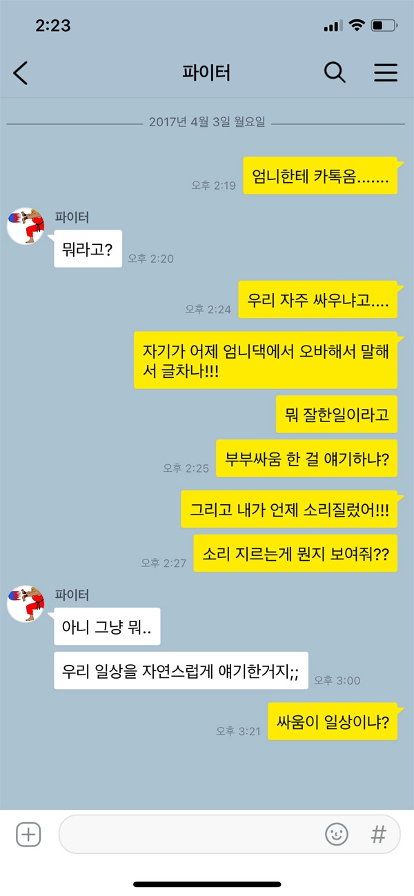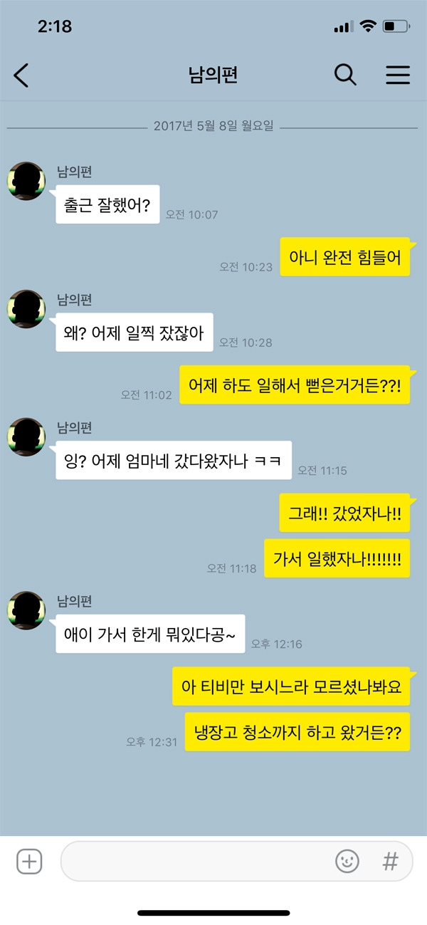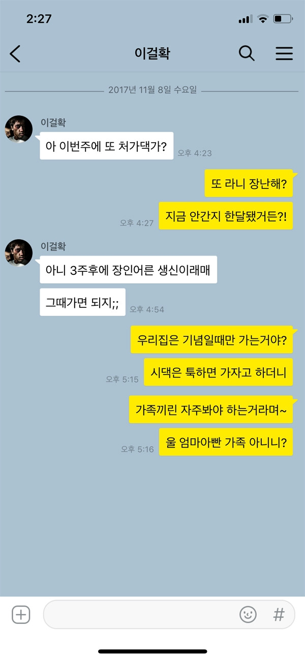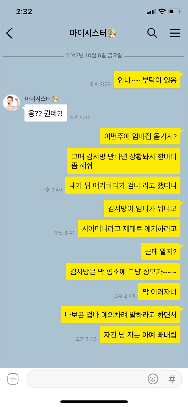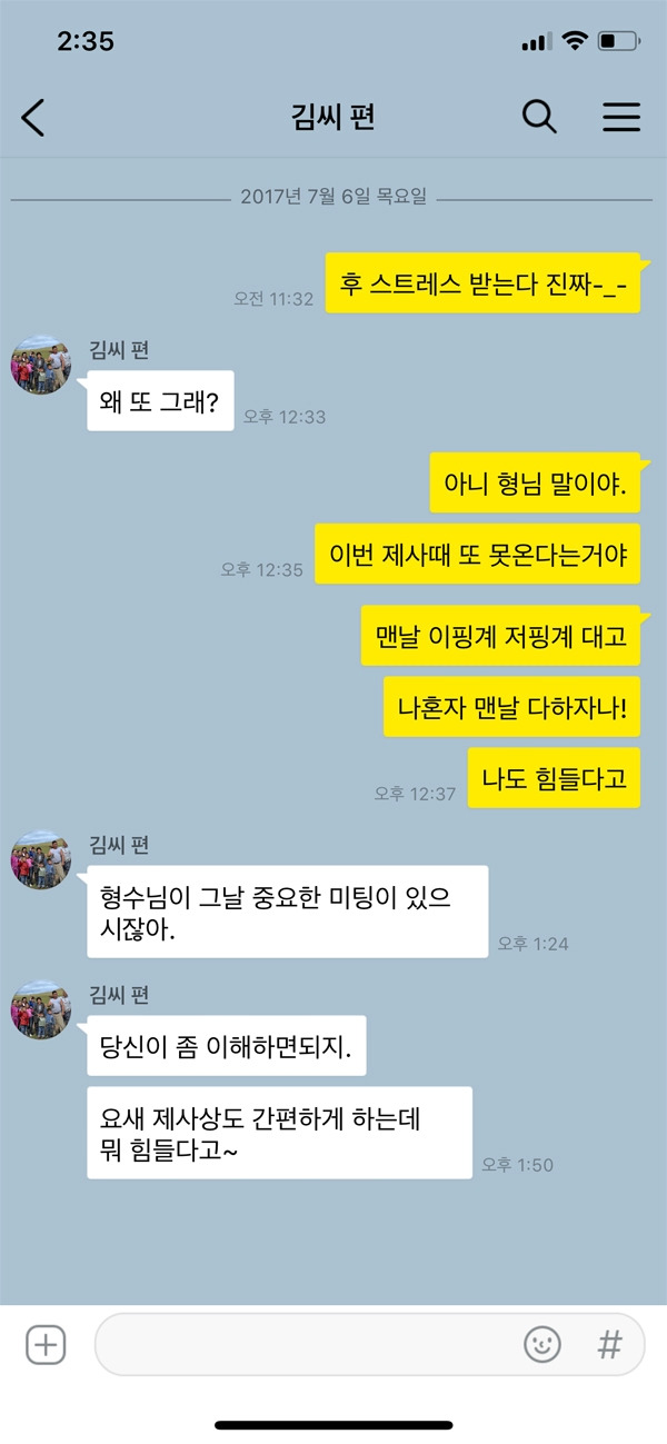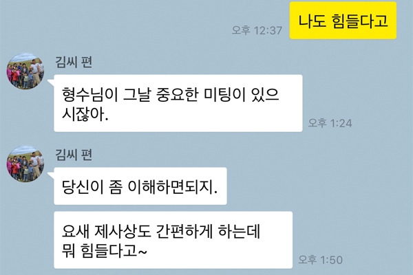 시댁 식구들도 가족이고 아내도 가족이다. 그 중간에서 관계 컨트롤을 잘 해야 하는 것이 바로 남편의 역할 중 하나다. 반대로 얘기하면 처가댁 식구들과 남편의 사이를 컨트롤 하는 것은 아내의 역할인 셈이다. 그러니 갈등이 생긴다면 누구의 편만 무조건 들기보다는 현명하게 생각해 행동하는 것이 중요하다. 위 카톡 내용처럼 제사의 경우 시댁 식구 전체가 참여해야 하는 행사다. 매번 빠지는 형님의 행동이 동서인 아내에게는 눈엣가시처럼 보일 수 있다. 해결 방법을 제시해야지 무조건 아내가 이해해라라는 식의 행동은 옳지 않다.