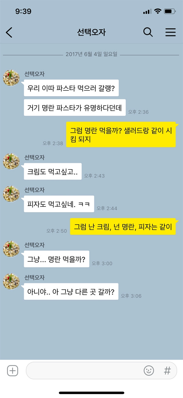 유난히 메뉴를 잘 못 고르는 사람들이 있다. 늘 마시는 아메리카노인데도 매번 아이스를 마실까, 따뜻한 것을 마실까 고민한다. 이미 예상되는 맛이지만 메뉴를 선정할 때 이것저것 다 맛보고 싶은 마음에 이런 갈등이 생기는 것이 아닐까? 예를 들면, 자장면과 짬뽕 사이에서 늘 고민하는 것처럼 말이다. 이럴 경우, 단호하게 정해주는 것이 그들에게는 도움이 된다. 같이 먹게 될 경우 친구가 갈등한 것을 모두 주문해 서로 만족감과 포만감을 가져가면 해결된다.