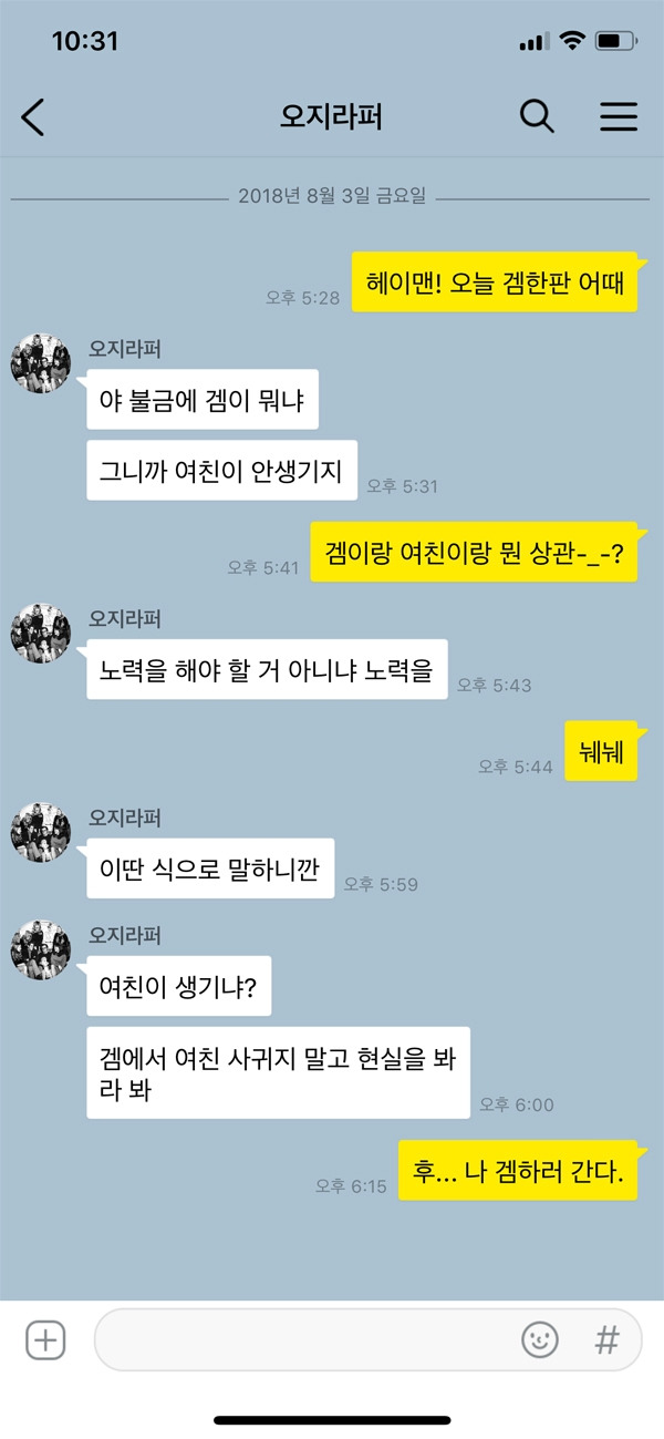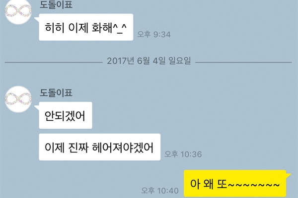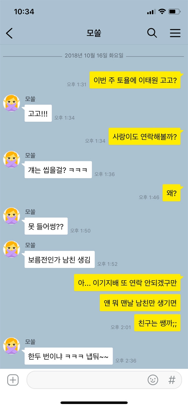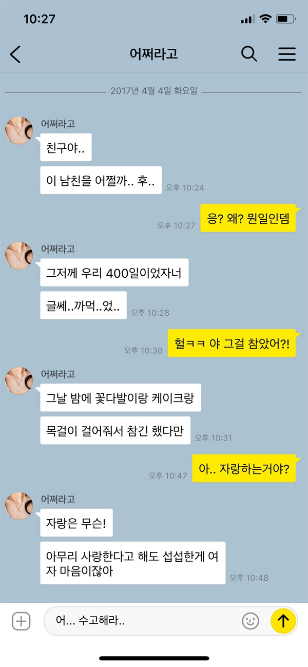 어떤 이야기를 하든 결국은 연인에 대한 자랑으로 끝나는 유형들이 꼭 있다. 심지어 연인에 대한 불만을 토로하다가도 자세히 듣다 보면 결국은 연인에 대한 자랑이다. 불만이라면 그냥 불만에 대한 이야기만 해야지 은근하게 돌려서 자랑하는 모습은 괜히 짜증나게 만든다. 특히 위 대화의 주인공처럼 선물로 받은 목걸이를 프로필 사진으로 해놓고선 기념일을 잊었네 마네 친구에게 떠드는 모습은 결국 ‘내 프사 좀 봐줄래?’와 같은 의미다.