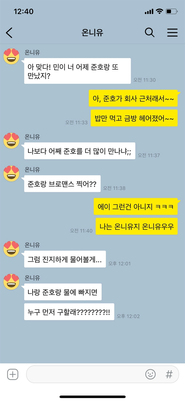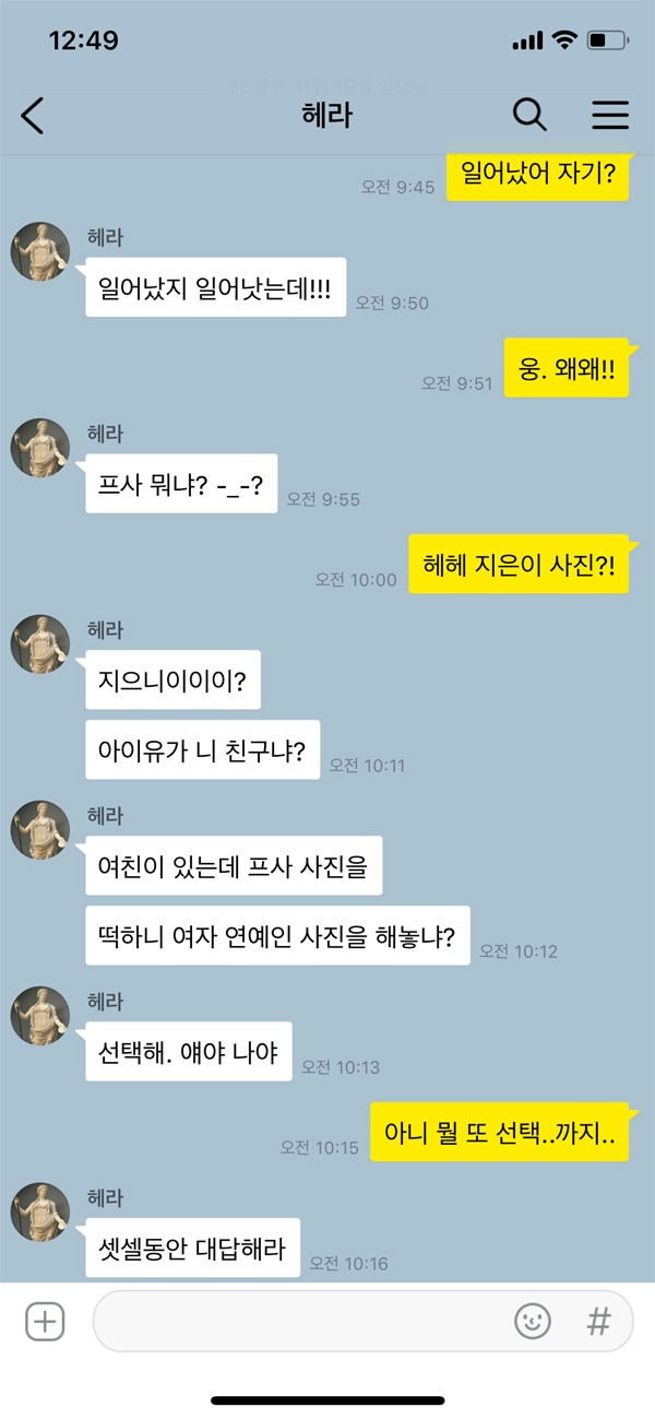 좋아하는 연예인의 사진을 프사로 해놨을 뿐인데 여친의 반응이 매우 냉랭하다. 어떻게 하겠다는 것도 아니고 그저 해놓은 것뿐인데 네 친구냐는 핀잔과 함께 둘 중에 고르라는 어이없는 질문까지 이어진다. 정말 여친이 연예인을 질투하는 걸까? 물론 당연히 아니다. 그저 남친의 프사에 다른 여자 사진이 아닌 여친 사진이 있길 바라는 마음뿐인 것이다. 왠지 다른 사람들이 남친의 프사를 볼 때 내 사진이 아닌 다른 여자의 사진이 있는 게 그냥 기분 나쁘다고나 할까? 같은 의미에서 남자들은 핸드폰 배경 화면도 조심하는 것이 좋다.