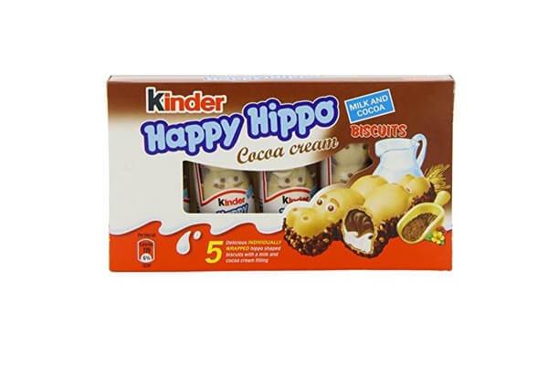 킨더 초콜릿은 부드러운 우유 맛의 밀크 초콜릿으로 전 세계적인 사랑을 받고 있으며 우리나라에서도 쉽게 찾아볼 수 있는 제품이다. 하지만 수입되지 않는 종류가 하나 있으니, 그것이 바로 킨더 해피히포 초콜릿이다. 해피히포는 귀여운 아기 하마 모양으로, 헤이즐넛 크림을 비스킷 안에 넣어 바삭한 식감을 가진 초콜릿 과자이다. 싱가포르에서는 묶음으로 저렴하게 구매 가능하기 때문에 선물용으로 추천하는 제품이다.
