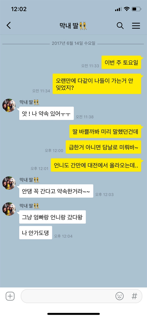 물론 가족이라는 게 매일매일 얼굴 보며 살지만 가끔은 집이 아닌 다른 곳에서 색다른 기분을 내며 즐거운 시간을 보내는 것도 좋다. 기분 전환에도 좋을 뿐 만 아니라 집에서 하지 못했던 이야기들도 장소가 바뀌면서 자연스럽게 할 수도 있기 때문이다. 특히 위 카톡 내용처럼 가족 구성원이 타지에서 생활해 오래간만에 집에 올 경우에는 함께 시간을 보내는 것이 좋다. 친구와의 약속이 매우 중요하거나 특별한 일이 아니라면 다음으로 미뤄 소중한 가족과 함께 시간을 보내는 건 어떨까?