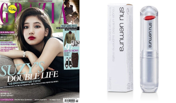 수지가 화보에서 바르고 나와서 유명해진 립스틱이 바로 슈에무라 M RD 165호이다. 맥 디바와 섞어 발라서 품절 대란을 일으켰다고 한다. 슈에무라 M RD 165호는 전형적인 레드컬러로 어떤 피부 톤이든 데일리로 사용하기 좋다. 크리미한 매트 타입의 립스틱으로 입술에 착 붙는 밀착력과 발색력을 가지고 있어서 더 유명해진 제품이다.