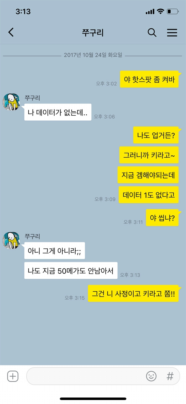 지불 능력이 없는 10대로서는 당연히 부모님이 지정해준 요금제를 사용한다. 동영상을 많이 보거나 데이터 소모가 큰 어플을 사용한다면 제한된 데이터 용량이 늘 부족할 수밖에 없다. 이때 피해 학생에게 데이터를 요구한다. 친구에게 선물하기 기능을 이용해 데이터를 요구하거나 혹은 함께 있다면 상대방의 핫스팟을 켜서 본인이 와이파이를 이용한다. 데이터가 눈에 보이는 것은 아니지만 이것도 엄연한 갈취라고 볼 수 있다. 더 나아가서는 한 아이의 핫스팟을 켜고 여러 사람이 동시에 접속해 100%였던 데이터 용량을 아예 없애 버리는 경우도 있다.