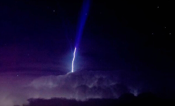 마치 분수처럼 솟는 파란 불기둥 같은 섬광, 그것이 바로 블루 제트 라이트닝이다. 뇌운 위쪽의 적란운 상층에서 가늘고 긴 형태로 발견되는데 고도 40~50km까지 섬광을 그린다. 뇌우에서 발생한 전기 흐름이 위로 올라가면서 주위의 분자들을 이온화시켜 동시에 빛을 내는데 구름에서 위로 솟구치는 메가 번개의 한 일종이다. 레드 스프라이트처럼 지상에 치는 벼락과 함께 발생하지 않으며 훨씬 빨리 사라지기 때문에 웬만해서는 블루 제트 라이트닝을 목격하기란 쉽지 않다.