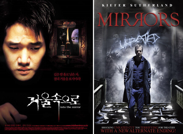 2003년 개봉한 영화 ‘거울 속으로’는 한 백화점의 거울 앞에서 의문의 죽음이 계속해서 일어나는 일을 소재로 했다. 일상 속에서 쉽게 접할 수 있는 거울이라는 매개체로 공포, 스릴러를 조성하는데 미국에서는 미러라는 제목으로 2008년 개봉했다. 잔혹한 고어물을 연출하는 것으로 알려진 알렉산드로 아야 감독이 리메이크를 시도했는데 원작에서 가져온 것은 오직 ‘거울’이라는 소재뿐, 영화의 내용이나 결론 등이 상당히 달라졌다. 심지어 거울 속에만 존재하던 그 무언가가 밖으로 확장되면서 잔인함의 극치를 보여준다.