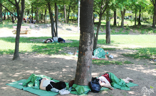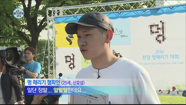 한강에서 열리는 멍 때리기 대회는 2014년 예술가 웁쓰양이 ‘과연 아무것도 하지 않는 것은 시간 낭비인가?’라는 질문을 던지며 시작한 참여형 퍼포먼스로 시작해 지금까지 꾸준히 이어오고 있다. 참가자들은 90분 동안 아무것도 하지 않고 멍하게 앉아 있기만 하면 된다. 그리고 미리 작성해 둔 참여 동기에 구경 온 사람들이 가장 마음에 드는 곳에 스티커를 붙여 그 개수와 15분 간격으로 참가자들의 심박 수를 합산해 우승자를 가린다.