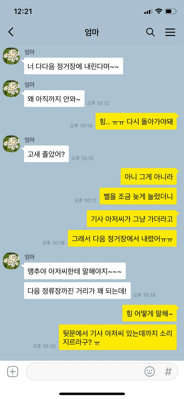 정류장 앞에 정차한 버스의 문이 열렸는데 멍하니 다른 생각을 하고 있다가 아뿔싸 하고 다급히 내리는 경우가 종종 있다. 문이 닫히려고 할 때 큰 소리로 ‘잠깐만요’라고 외치면 웬만해서 기사님들은 기다려준다. 하지만 소심한 사람들의 경우에는 큰 소리를 질러 시선을 받기보다는 차라리 다음 정류장에서 내리는 것을 선택한다. 그렇게 기사님을 부른다고 해서 다른 사람들이 웃거나 놀리는 것도 아닐 텐데 본인 스스로 부끄럽기 때문이다.