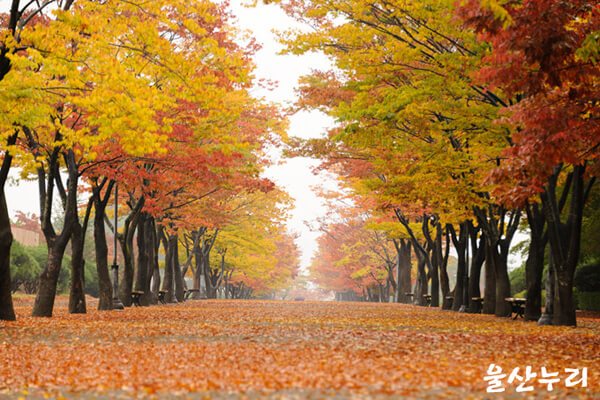 서울 대학로에 마로니에 공원이 있듯이 울산의 울산체육공원 내에도 마로니에 길이 있다. 키가 큰 마로니에 나무가 자라고 있어 이런 이름이 붙었는데 산책로가 매우 잘 조성되어 있다. 특히 시즌이 되면 이 마로니에 길에 그동안 모아두었던 낙엽을 싹 쏟아 부어 낭만의 길을 조성하여 지역 주민을 비롯해 관광객들이 많이 찾고 있다. 넝쿨이 올라온 나무 사이에 놓인 벤치들은 베스트 포토 존으로 인생샷을 남겨볼 수 있다.
