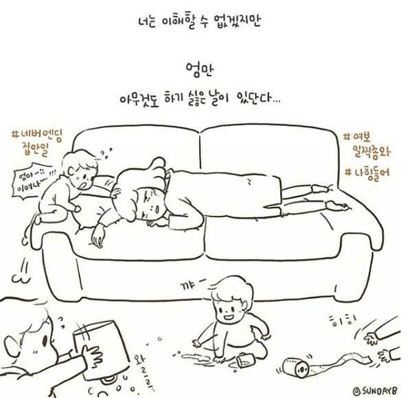 ‘썬비’는 작가 자신인 노란 단발머리 엄마와 노란 곱슬머리 아기 마요를 주인공으로 그린 육아툰이다. 아빠 조엘은 강아지로 등장한다. 담백한 구조에 수많은 감정과 깨물어주고 싶은 귀여운 아기의 모습은 사랑하지 않을 수 없다. 썬비는 세 살 아기 ‘마요’를 둔 엄마이자 디자이너로 ‘너의 모든 순간을 기억할게’ 첫 번째 전시회를 열었고, ‘썬비의 그림일기’는 육아힐링북 ‘#월화수목육아’로 출간됐다.