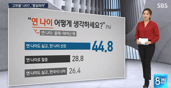 2018년 SBS의 설문 조사에 따르면 우리나라에서 사용하는 나이 셈법을 하나로 통일했으면 좋겠다는 응답이 무려 92%를 넘었다. 그중에서도 만 나이 선호도가 약 45%로 가장 높았으며 한국식 나이 선호도가 가장 낮은 것으로 드러났다. 다양하고 복잡한 나이 셈법 탓에 여러 사회적 비용이 드는 만큼 통일된 나이 셈법에 대한 공론화가 필요할 것으로 보인다.