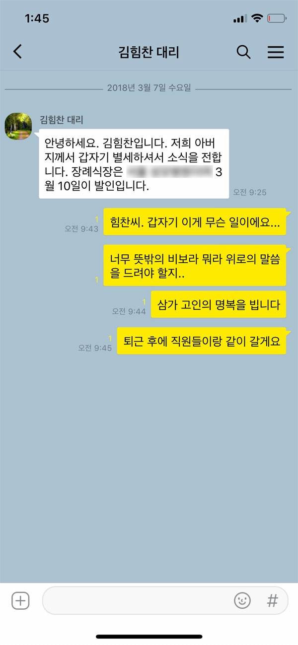 다양한 경조사 중에서 가장 조심스럽고 선뜻 보내기 힘든 메시지가 바로 누군가가 돌아가셨을 때가 아닐까? 이럴 땐 최대한 담담한 문체를 사용해야 하고 너무나 당연한 얘기지만 이모티콘은 절대 삽입해서는 안 된다. 부고 안내 매시지를 받았을 때는 너무 빠르게 답장을 하는 것보다는 조금 시간을 들여 정성스럽게 쓰는 것을 추천한다. 뜻밖의 비보에 슬픈 마음을 금할 길이 없다, 삼가 고인의 명복을 빈다, 부디 편히 쉬시길, 등의 문구를 활용하면 좋다.