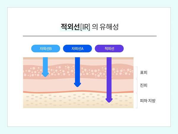 그런데 적외선(Infrared ray, IR)은 자외선보다 더 긴 파장과 강한 열 작용을 지니고 있어 열선(熱線)이라고 불린다. 적외선은 파장이 길어 산란효과가 적고 공기 중에 잘 투과되어 주로 공업용 기기에 사용되는데, 이러한 적외선에 직접적으로 노출될 경우 적외선이 피부 깊숙한 곳까지 침투해 피부 온도를 높이고, 노화를 촉진시킨다. 특히 표피 또는 진피까지 도달하는 자외선과 달리 피하 지방까지 도달해 콜라겐을 파괴시켜 피부 탄력을 저하시키고 주름을 생성하기 때문에 가급적 적외선에 직접적으로 노출되지 않도록 주의해야 한다.