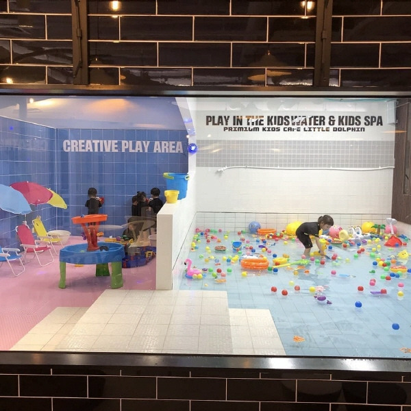 장난감 대신 물감과 거품, 물놀이를 즐길 수 있는 이색적인 카페로 다른 키즈 카페와는 확연히 다른 점이 느껴진다. 정원 15명 사전 예약제로 진행되는 프로그램은 매달 달라지는 촉감놀이부터 시작된다. 그다음 본격적인 물감놀이가 시작되면 아이들은 원 없이 벽면에 페인트칠을 할 수 있다. 선생님이 간단하게 샤워를 시켜주고 나면 온수로 채워진 얕은 유아 풀에서 다양한 장난감을 갖고 놀고 하이라이트인 거품 놀이까지 끝내고 나면 2시간 프로그램이 마무리된다.