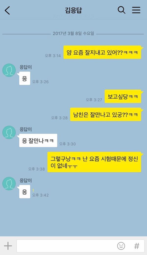평소 메시지를 주고받을 때, 영혼 없이 답변하는 유형이다. 요즘 이런저런 일로 힘들다는 이야기를 하고 고민을 털어놓으면 “아, 힘들겠다.”, “그렇구나.”, “힘내ㅋㅋ” 등 성의 없어 보이는 답변을 보내, 더욱더 힘빠지게 한다. 내 이야기가 듣기 싫은 건지 메시지 보내는 게 귀찮은 건지, 어느 쪽이든 기분 상하기는 마찬가지다.