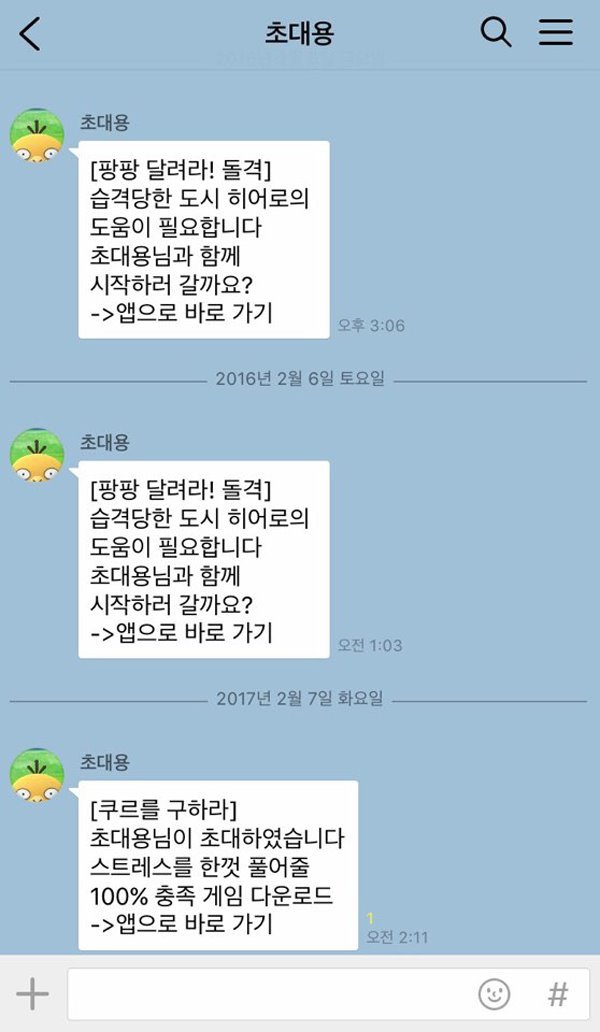 가끔 게임 초대 메시지를 받는 경우라면 어떻게든 이해할 수 있다. 하지만 평소 연락 한 번 없던 지인에게서 매일같이 오는 게임 초대 메시지 은근히 신경 쓰이고 짜증 난다. 특히 잠들기 직전, 게임 초대 메시지로 잠이 깬다면 짜증은 배가 된다. 초대를 거절하면 또 다른 게임 초대로 이어지는 경우도 종종 있다.