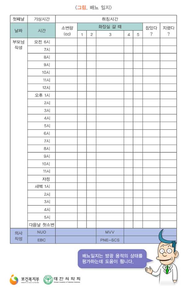 자기기입식 방식을 통해 배뇨량, 배뇨 불편감, 화장실을 다녀온 횟수 등 증세를 매일 메모하여 요실금 상태와 정도를 정확하게 파악하는 것이 중요하다. 배뇨일지를 작성하여 자신의 배뇨 습관을 체크한다면 자신에게 맞는 배뇨 습관을 모색하고 치료에도 효과적인 방법을 추구할 수 있다. 배뇨일지를 통해 배뇨 이상 증세가 오랜 기간 지속되고 있다면 전문의 상담을 진행하여 수술을 최소화하는 방향을 추구해야 한다.