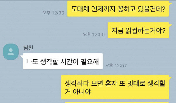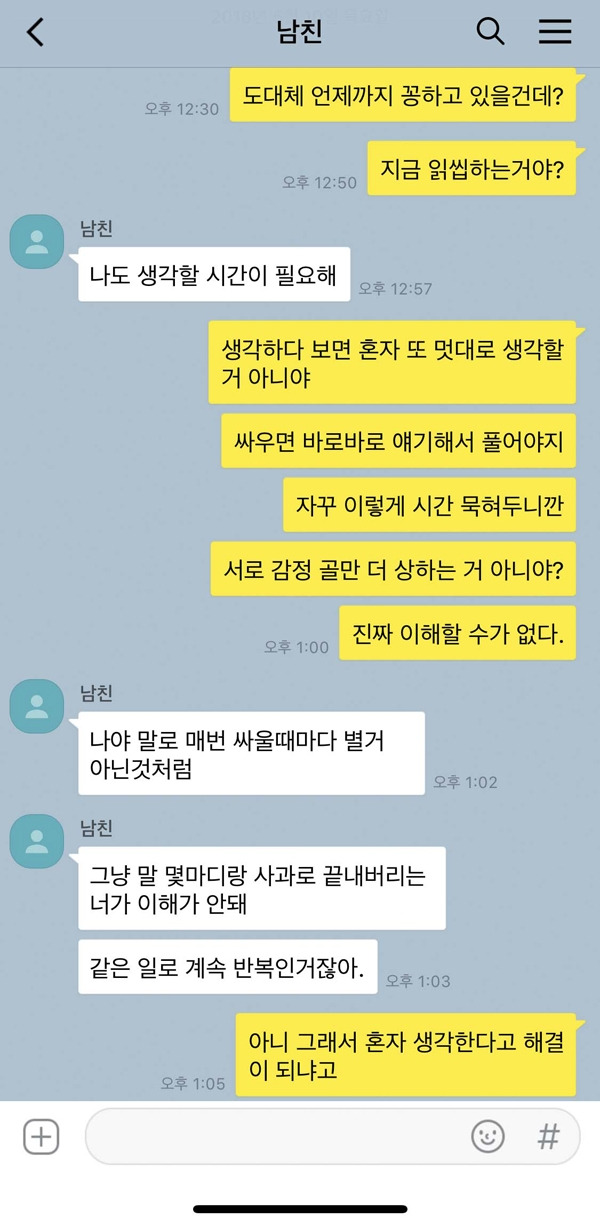불편한 감정을 마음 한구석 조금이라도 남겨 두면 못 참는 사람들이 있는 반면, 이미 상해버린 기분이 다시 회복되는 데 시간이 필요한 사람들이 있다. 전자의 입장에서는 후자의 사람이 너무나 답답하게 느껴진다. 싸우면 말로 풀어야지 서로 꽁하고 있으면 해결될 것도 안 된다고 생각하기 때문이다. 반면 후자의 생각은 좀 다르다. 다툼의 원인이 무엇이든 그 깊이가 얼마큼이든 이미 마음의 상처가 된 상태에서는 어떤 사과나 말도 진정성이 안 느껴지기 때문이다. 모든 일은 시간이 지나면 서서히 잊히듯 감정 또한 마찬가지라 자신만의 시간을 가지면서 격해진 감정을 추스르고 정리가 필요하다고 생각한다.