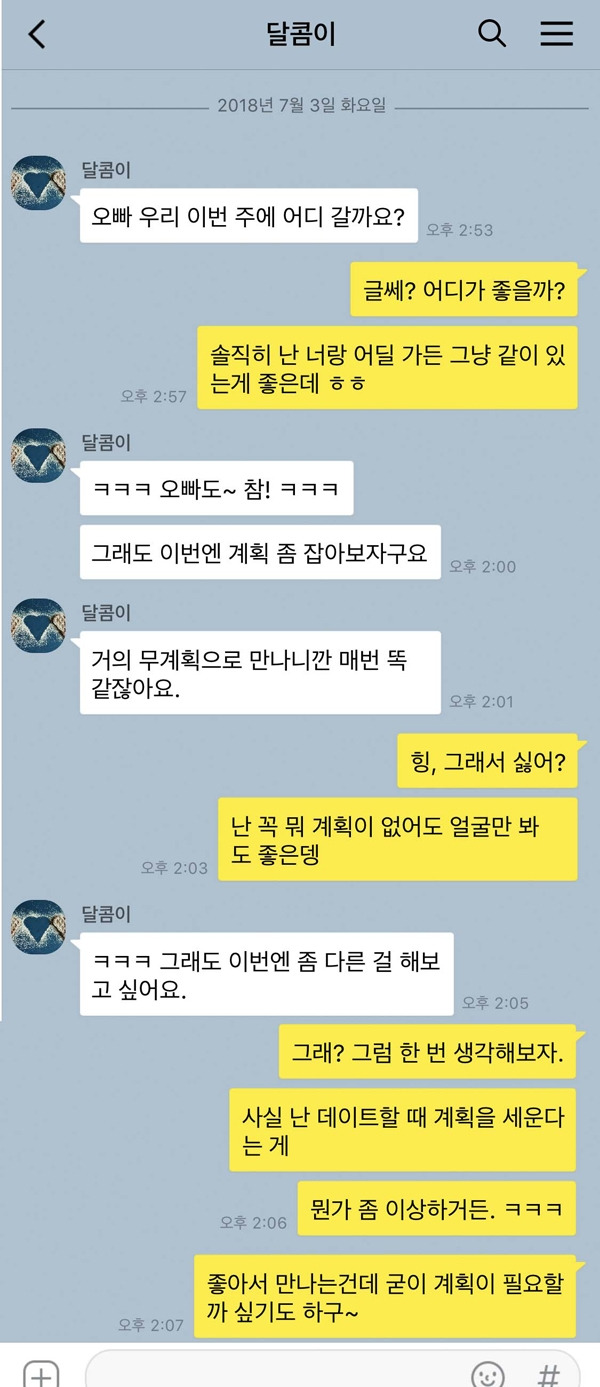 개인마다 연애를 하는 방법을 조금씩 다르다 보니 데이트를 할 때도 고스란히 묻어난다. 매 순간 늘 열정적으로 무언가를 하며 특별한 이벤트를 즐기려는 사람도 있고 딱히 하는 것 없어도 같이 보내는 시간만으로도 소중한 사람도 있다. 평소 자주 만나지 못하는 사이라면 데이트 날에는 좀 더 계획적으로 움직여 제한된 시간 안에 효율적으로 많은 추억을 만들고 싶어 할 것이다. 그럼에도 불구하고 상대방이 계획 세우는 데 있어 미지근한 반응을 보인다면 ‘만나기가 싫은가?’라는 생각이 들 때도 있다. 물론 상대방은 그런 의도로 보인 반응이 아니다. 어느 곳에 있든지, 무얼 하든지 현재 같이 있다는 것이 가장 중요하기 때문에 데이트 계획은 크게 필요하지 않다고 생각한다.