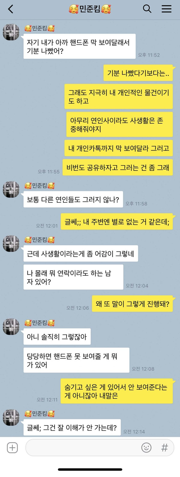 연인은 서로의 일상을 공유하기도 하지만 여기에서도 입장 차이가 나타날 수 있다. 연인이기는 하지만 엄연히 상대방은 남, 그렇다면 상대방의 어느 부분까지 공유를 해야 하는 것일까? 대표적인 예가 핸드폰이다. 잠금 해제 비밀번호, 카톡 비밀번호 등을 공유하는 사람과 엄연한 사생활인데 그런 것까지 공유해야 하냐는 날 선 의견이 종종 대립하기 때문이다. 아무리 연인이라도 보여주고 싶은 것과 그렇지 않은 것이 존재하는데 무조건 공유를 외치는 상대방이 이해가 되지 않는 사람들도 있다. 반면 연인 사이에 비밀은 없어야 한다고 굳게 믿는 사람들은 사생활이라면서 핸드폰 비밀번호를 공유하지 않는 상대방이 뭔가 숨기고 있거나 당당하지 못하기 때문이라고 생각한다.