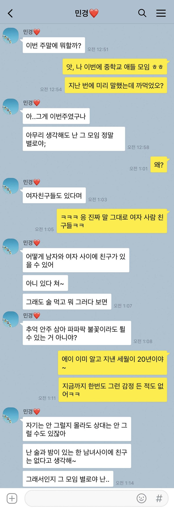 남사친과 여사친, 과연 존재할 수 있는 것인가에 대한 문제는 입장 차이를 좁히기 힘든 문제 중 하나다. 그래서 주위를 둘러보면 이 주제로 싸우는 연인들이 꽤 많다. 이성 간에도 친구가 될 수 있다고 주장하는 사람들은 동성 친구처럼 친구 이상의 감정은 절대 없다고 주장한다. 학창시절부터 함께 한 경우라면 더더욱 그렇다. 하지만 이런 입장을 반대하는 사람들은 감정이라는 것이 언제든 쉽게 변할 수 있는 것이라고 말한다. 특히 술자리에서는 분위기에 휩쓸려 친구 이상의 감정이 충분히 생길 수 있다고 생각한다. 그래서 연인이 남사친 혹은 여사친과 단둘이 만나는 것은 절대 있어서는 안 될 일이며 여럿이 모이는 술자리라도 그 자리에 자신의 연인이 참석하는 것을 꽤나 싫어한다.