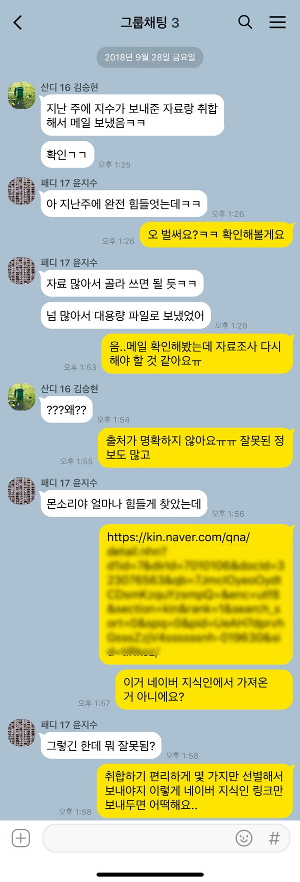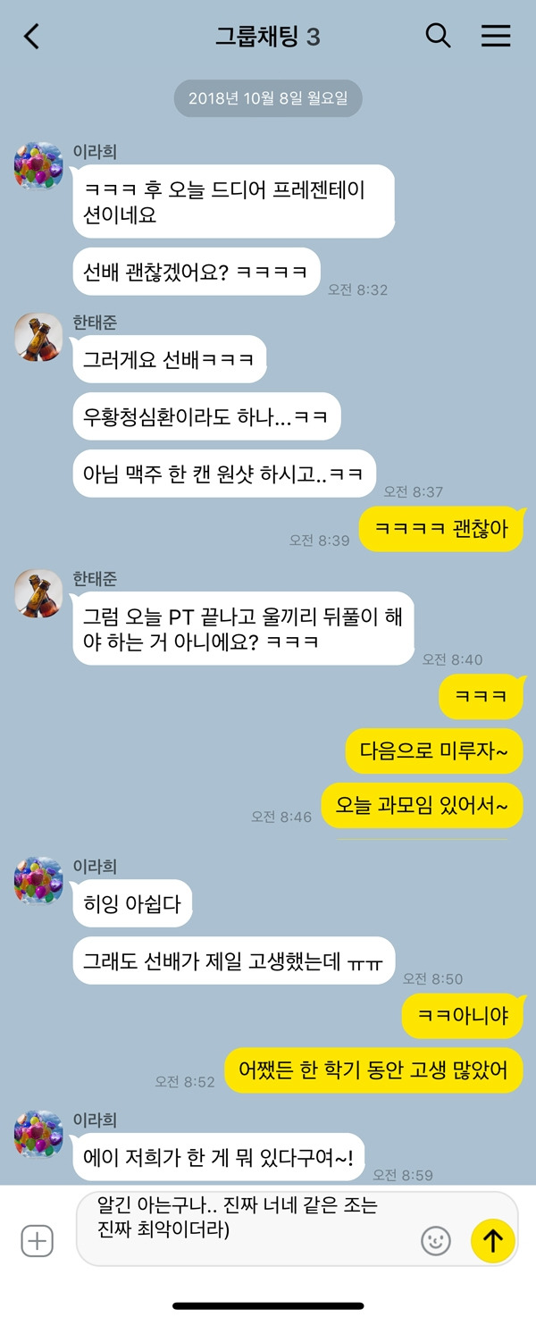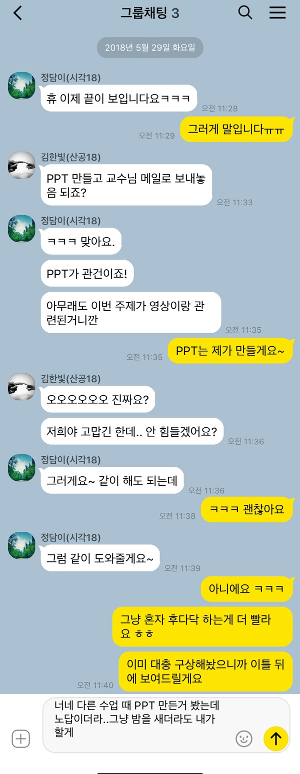 교수님들은 협동심과 커뮤니케이션, 상호작용을 배우고 또 나중에 취업 후 회사에서 많이 접하게 될 팀 단위의 프로젝트를 사전에 경험해볼 수 있다는 취지에서 조별 과제를 굉장히 독려하신다. 표면상의 이유는 참 그럴듯하지만 학생들 입장에서 조별 과제는 정말 싫을 때가 많다. 물론 사회는 나 혼자 살아가는 것이 아니기에 이런 공동의 작업을 통해 결과물을 만드는 것도 중요하지만 나와 같은 생각을 하지 않는 사람들이 더 많다. 말과 해동 하나하나가 얄미운 조원들도 있고 도움은커녕 오히려 방해만 해서 진행을 못 하게 하는 사람들도 있다. 조별 과제에 대한 평가는 개인적으로 이루어지는 것이 아니기 때문에 개개인의 노력 여부는 크게 중요시되지 않는다. 나름 열심히 한다고 하지만 내 기준에는 전혀 못 미칠 때, 내가 하고 싶지 않아도 특별히 다른 누군가에게 신뢰가 가지 않아 결국 내가 하게 될 때, 그래서 결국은 나조차 이기적으로 행동하고 싶어지는 충동이 종종 들게 된다. 이런 모습은 카톡 대화에서도 조금씩 드러난다. 배려하는 듯하지만 결국 잇속을 차리려는 속마음, 아무 뜻 없는 것 같지만 은근하게 담고 있는 깊은 빡침 등 팀플로 고생하는 학생들의 단톡으로 그들의 속마음을 살펴보자.
