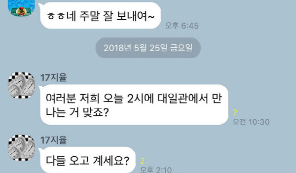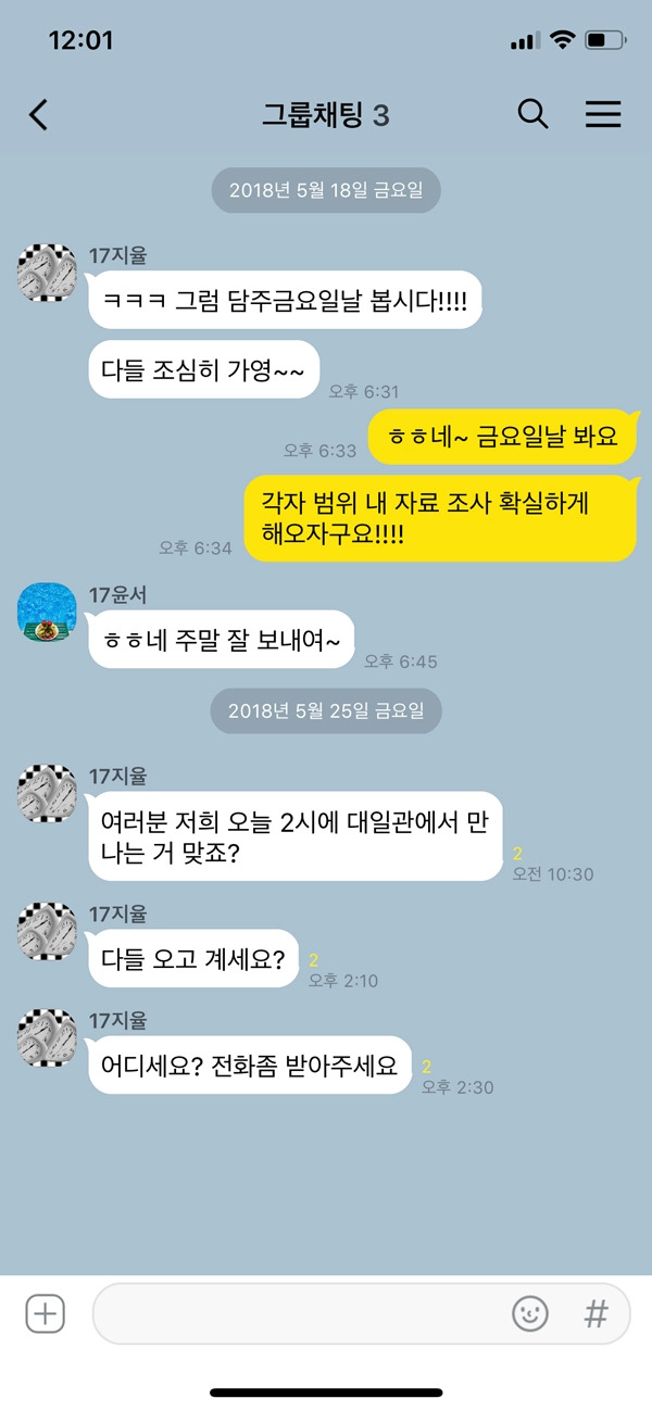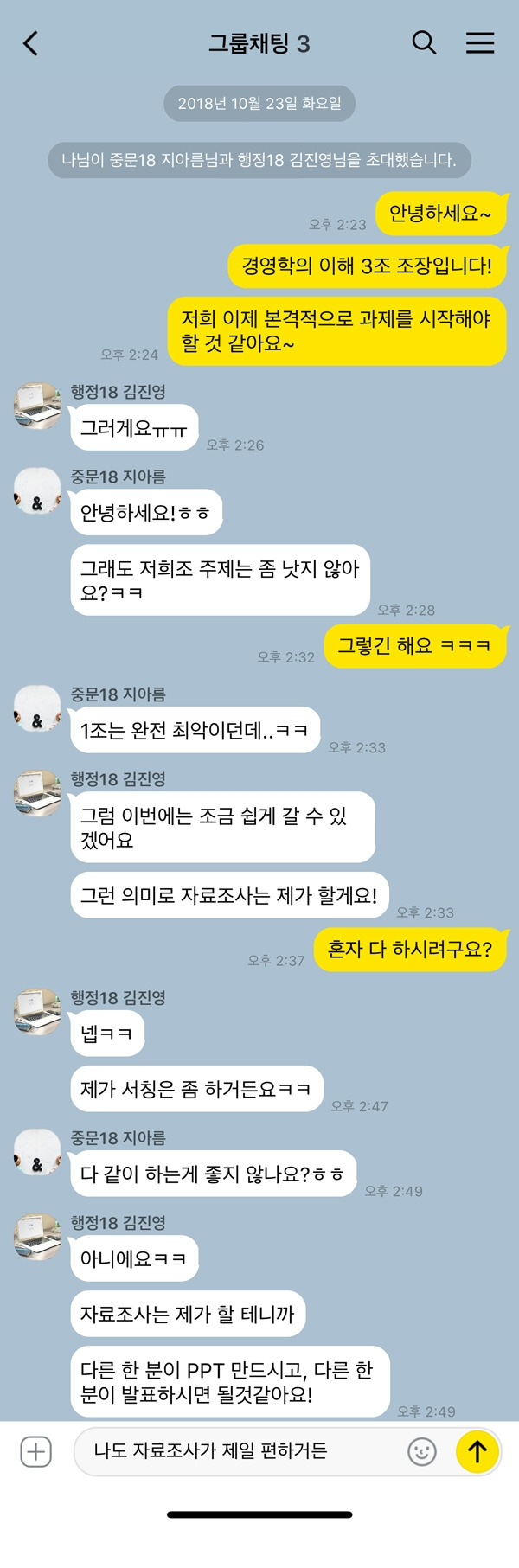 전공 수업의 조별 과제는 동기들과 하다 보니 적극적인 참여율을 보이면서 다들 열심히 하는 경우가 많다. 하지만 교양 과목의 조별 과제는 처음 만나는 타과 학생들, 또 학번이 다른 사람들이 모이다 보니 생각보다 단합이 쉽지 않다. 시작은 괜찮았더라도 조금씩 지나면서 나 하나쯤이야 괜찮겠지라는 생각으로 소극적인 태도를 보일 수도 있다. 물론 누구나 그런 것은 아니다. 교양 과목도 전공 못지않게 좋은 점수를 받고 싶은 학생들은 대놓고 말하지는 않지만 끊임없이 카톡 메시지를 통해 어필한다. 특히 스케줄 조절이 쉽지 않은 타과 학생들의 모임이다 보니 어렵게 정한 회의 날 같은 경우도 며칠 전부터 일정을 재차 확인하고 당일 모임 한 시간 전까지 메시지를 보내면서 전원이 카톡을 읽었는지 안 읽었는지를 확인해 참석률을 높이려고 한다.