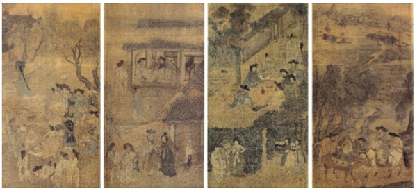 단원 김홍도가 80cm가 넘는 병풍에 그린 풍속화로 봄, 여름, 가을, 겨울 사계절에 따라 각 2첩씩 8첩으로 구성했다. 특유의 해학과 힘이 넘치는 뛰어난 작품성으로 명작으로 손꼽힌다. 1800년대 후반 프랑스 외교관 루이 마랭이 구입했으며 현재 프랑스 국립 기메박물관에 소장되어 있다. 2017년 서울교통공사가 해외 반출 문화재를 기억하기 위해 제작한 ‘귀향 문화열차’에 조선 왕실 회화 ‘십장생병풍’과 함께 부착되기도 했다. 순종이 어린 시절 천연두에서 나은 것을 기념하며 그려진 ‘십장생병풍’은 1924년 무역상 테일러상회를 통해 미국 오리건대 박물관으로 팔렸다.