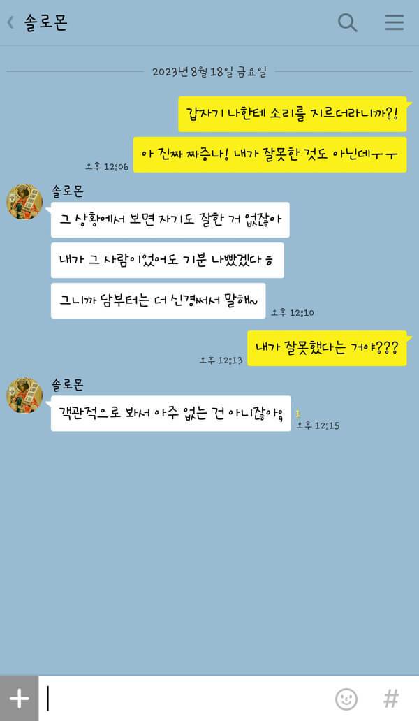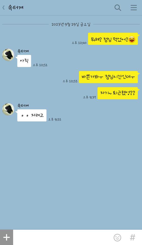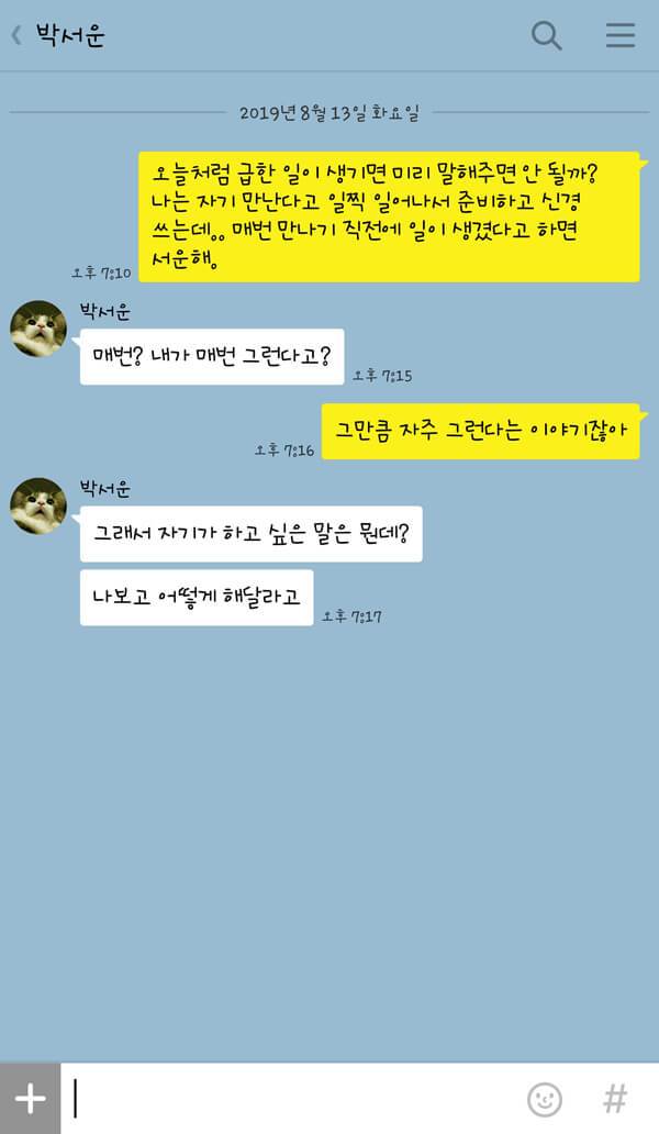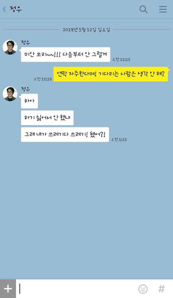 연애 초기에는 그렇지 않았다. 항상 내가 어디에 있는지, 무엇을 하는지, 심지어는 어떤 음식을 먹고 있는지를 묻는 내용의 카톡이 쉼 없이 오곤 했다. 하지만 이제 애정이 식었는지 내가 먼저 보내지 않으면 연락도 없을뿐더러 대답은 언제나 “응, 아니.”, “그래.” 라는 식의 단답형이다. 그나마 이 정도는 낫다. 간혹 “ㅇㅇ”처럼 자음만 쓰여있는 카톡은 사람 속을 더 뒤집어놓는다. 차라리 ‘심심이’나 ‘Siri’와 대화하는 편이 낫겠다 싶을 정도.