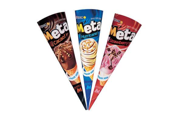 딸기와 바닐라 그리고 피스타치오와 바닐라, 커피와 쿠키 등 맛있는 조합으로만 이루어진 콘 아이스크림, 메타콘. 메타콘의 풀 네임은 ‘Meet Two tAste Corn’으로 직역하면 ‘맛있는 두 가지 콘을 만난다’라는 의미다. 아이스크림 한 개에서 2가지 맛을 즐길 수 있다는 점에 착안해서 이런 이름이 탄생했는데 영어 스펠링에서 앞글자(taste에서는 A)만 선택해 META라는 말을 만들었다. META라는 단어는 ‘함께’라는 뜻도 있어 중의적으로 표현했다.