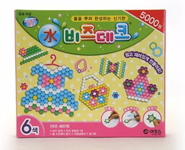 6가지 색으로 구성된 비즈 데코다. 기존 비즈 데코가 열을 이용해 작품을 완성하는 것과 달리, 물을 뿌려 작품을 완성하기 때문에 아이들이 안전하게 사용할 수 있다. 기본판에 도안을 넣은 뒤, 도안을 따라 작품을 완성하면 된다. 완성된 판위에 물을 뿌린 뒤 완전하게 건조하면 예쁜 비즈 작품이 완성된다. 아이들이 직접 원하는 도안을 작품으로 구현할 수 있어 성취감을 줄 수 있으며, 집중력을 향상시킬 수 있는 장난감이다.