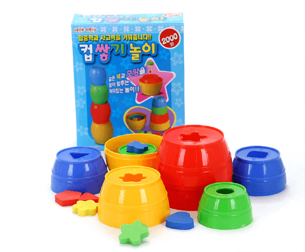 크기가 다른 컵이 여러 개 들어있다. 크기가 큰 컵부터 작은 컵의 순서대로 쌓아 올릴 수 있으며, 각 컵의 아랫부분에 다양한 모양의 구멍이 뚫려 있어 구멍에 맞는 모양을 찾아 맞출 수 있다. 아이들이 크기와 도형, 색상을 재미있게 접할 수 있는 장난감이다.